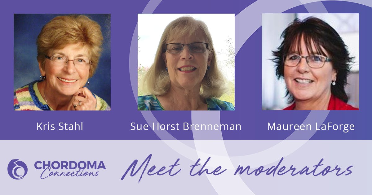 Chordoma Connections offers a safe space in which members can ask questions, share experiences, and get support from others who have been there. Many amazing individuals are active within the community, offering their input, knowledge, and support to help their peers navigate the ups and downs of living with chordoma, but no one gives of their time and compassion more generously or more dependably than our three incredible volunteer moderators: Kris Stahl, Sue Horst Brenneman, and Maureen LaForge.