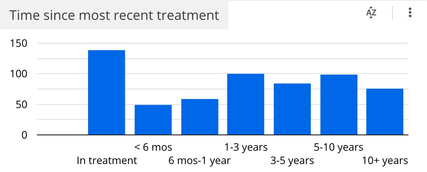 - 1 in 5 respondents are currently in treatment; this could mean that they have recently been diagnosed and are undergoing their first treatments, being treated for recurrent disease, or in longer-term systemic therapy treatment for advanced or metastatic disease.